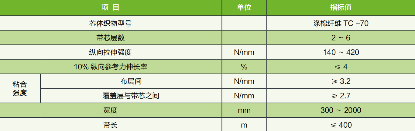 执行GB/T7984-2001《输送带 具有橡胶或塑料覆盖层的普通用途织物芯输送带》标准。