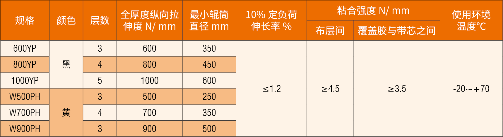 骨架材料选用低收缩、高卷曲度的合成聚酯纤维浸胶帆布,采用抗静电橡胶配方,是粮食及食品行业应用广泛的橡胶提升带。