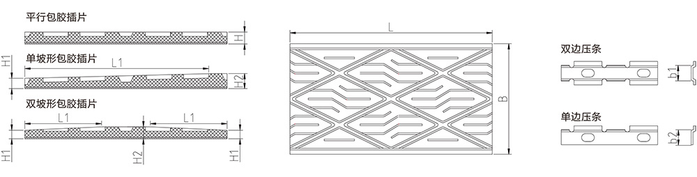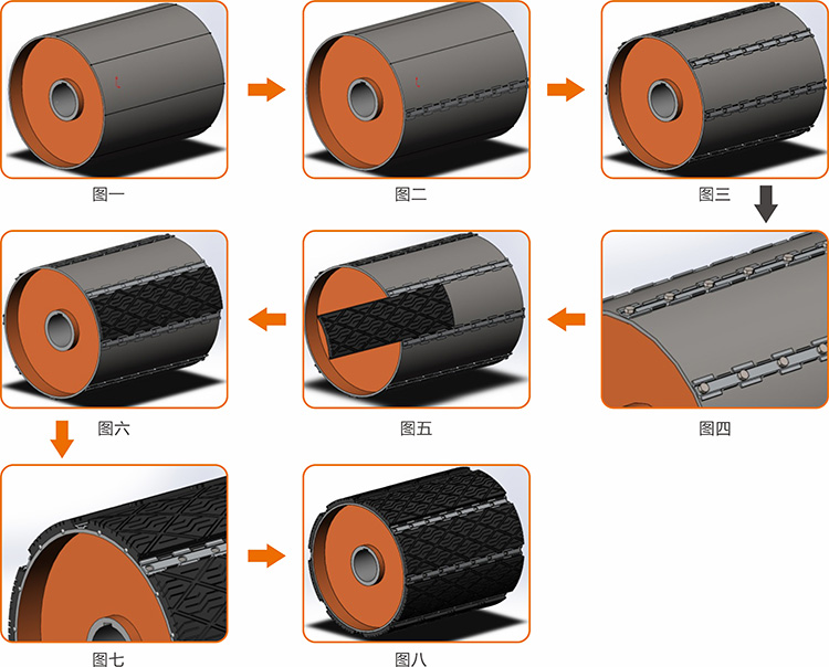 如配套方案为单边压条,在头轮包胶插片插入已安装在均分线位置的第一根单边压条压脚后,用未紧固的另一根单边压条压住插片金属边的另一侧,用适当夹具(如大力夹钳)将未紧固的单边压条与驱动滚筒夹紧,调整未紧固的单边压条与已另一侧已紧固的压条平行度后,定位焊接或螺钉紧固。完成第一组包胶插片的安装后,再从第二个均分线位置开始安装第二组包胶插片及压条,以此类推,直到所有单边压条焊接固定或螺钉紧固在驱动滚筒上。